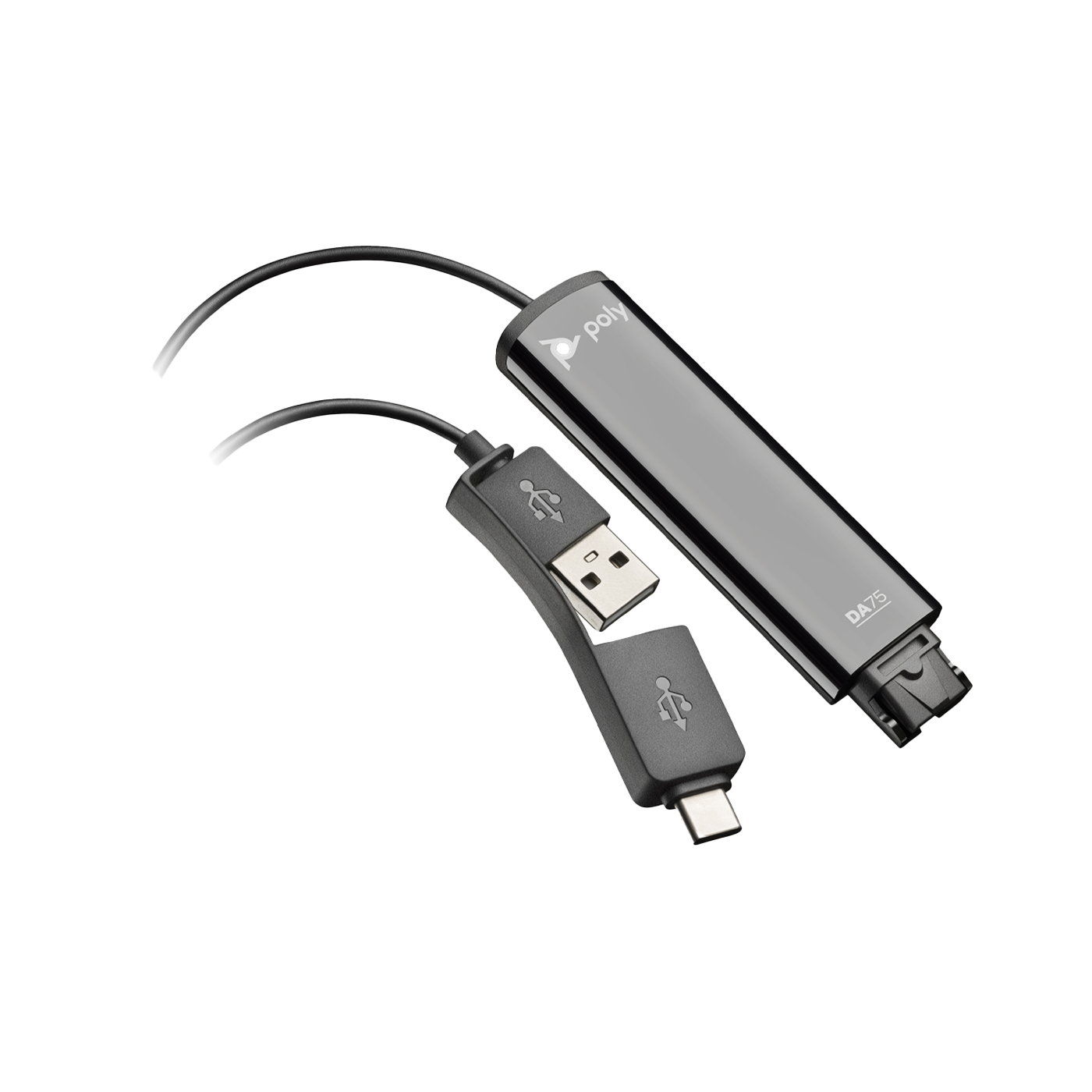 De Poly DA75 is een robuuste adapter die je Quick Disconnect-headset koppelt aan moderne USB-A of USB-C apparaten. Dankzij ruisonderdrukking, ondersteuning voor hifi-audio en geavanceerde beheerfuncties via Plantronics Hub of Poly Lens, is deze adapter perfect voor professionele omgevingen waar heldere communicatie essentieel is.